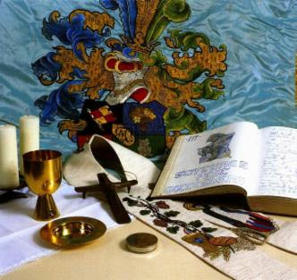 Entwurf Stola WCV-Seelsorger (1994) und Gästebuchbild Stiftungsfestgottesdienst